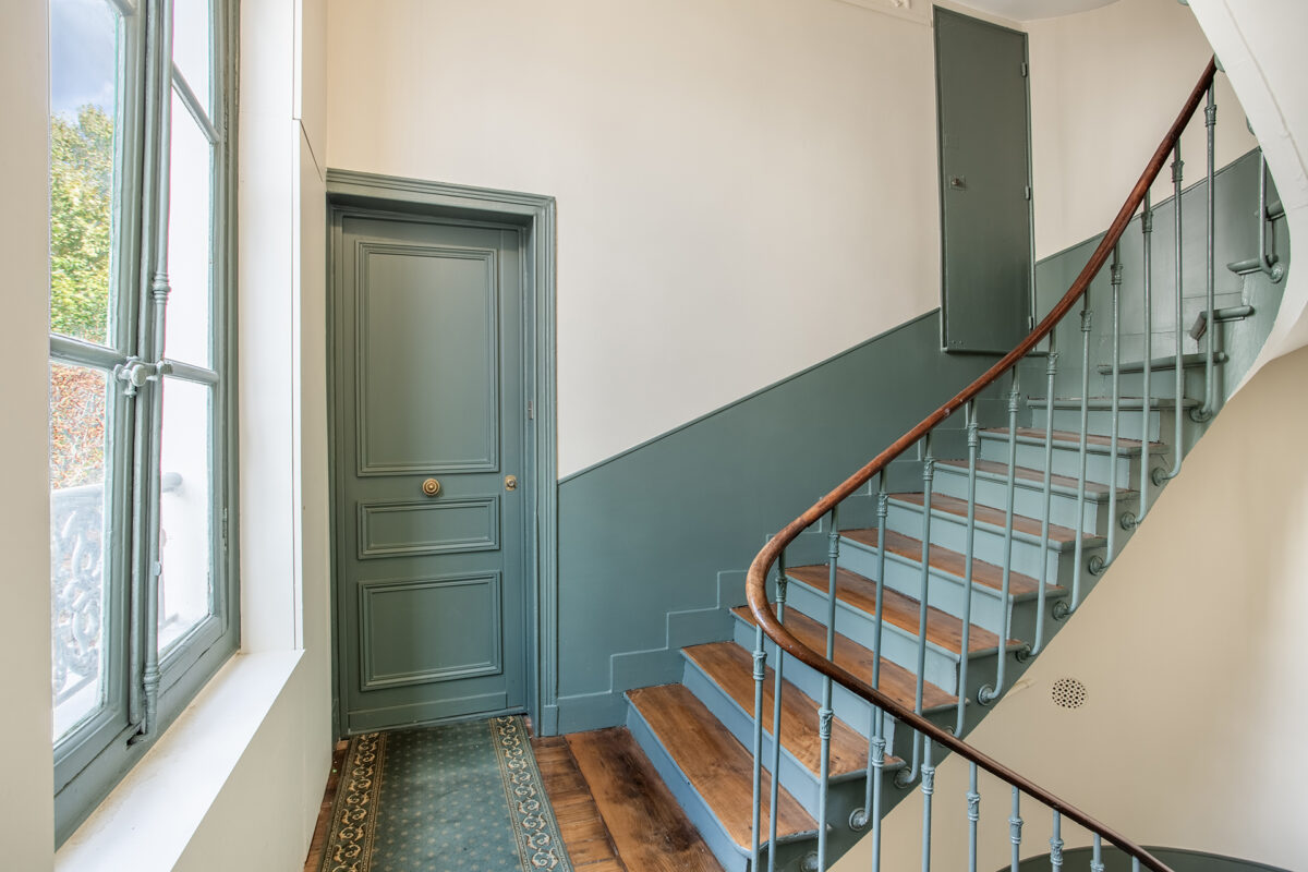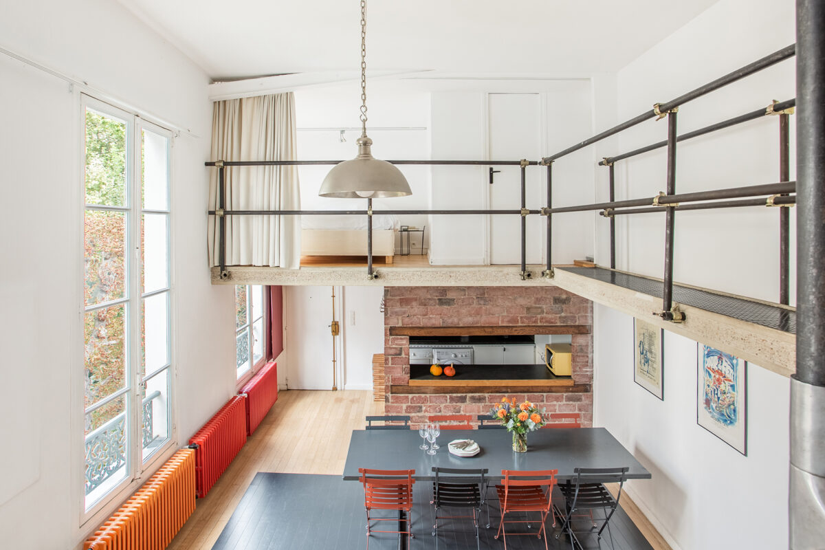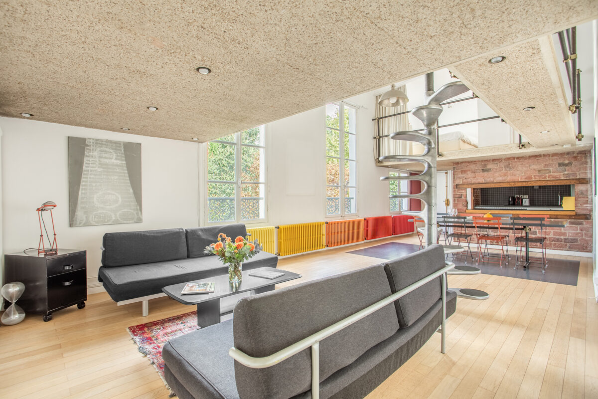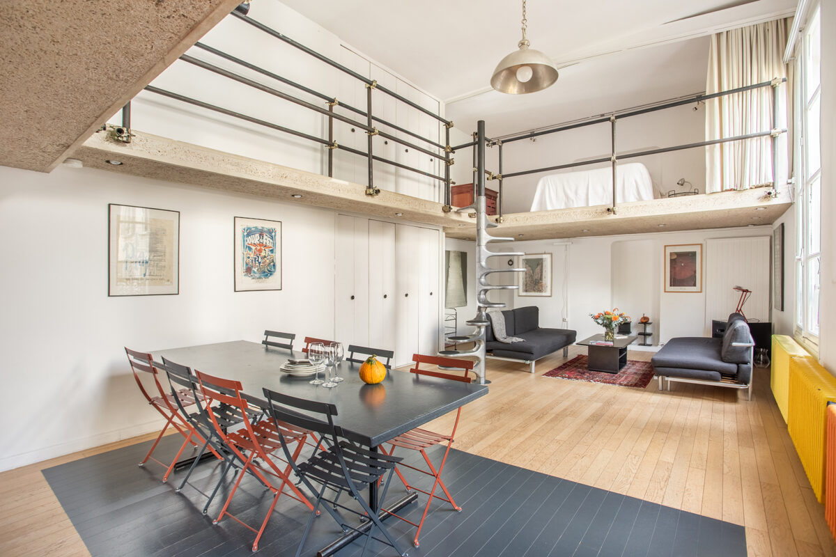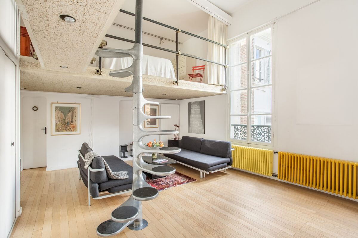 Au second niveau accessible par un escalier hélicoïdal du célèbre designer Roger Tallon, une mezzanine en béton contourne la pièce principale et offre deux espaces pouvant servir respectivement de chambre ou de bureau, ainsi qu’une salle d’eau avec des toilettes et des rangements.